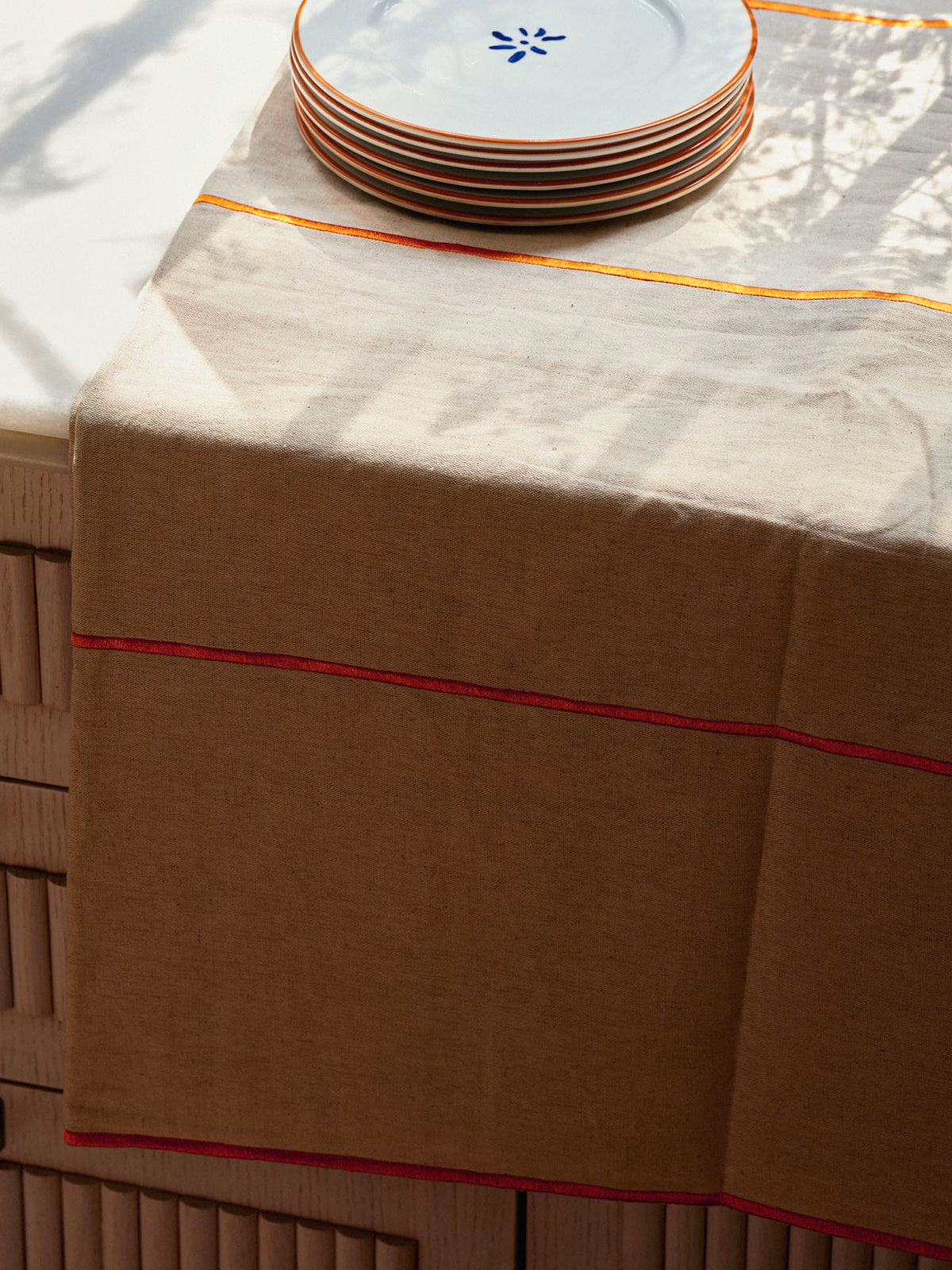 Mantel de algodón y lino con diseño de rayas bordadas en color naranja.