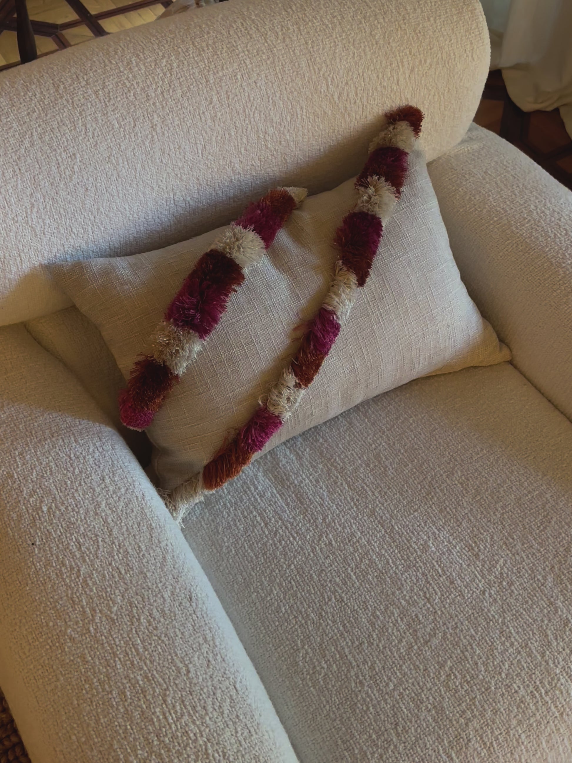 Pillow with beige fabric and brush fringe trim in fucsia, rust and beige.